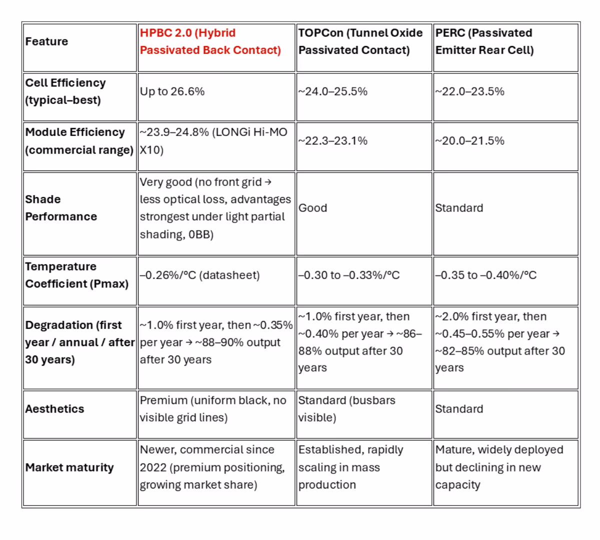 Confronto tra HPBC 2.0, TOPcon e PERC